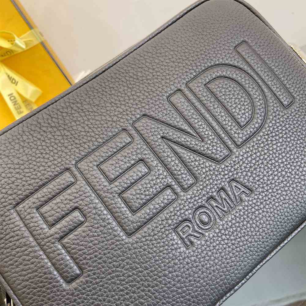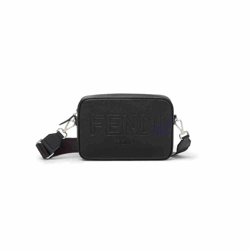 Compact shoulder bag in black full-grain leather with 3D-effect Fendi Roma logo.