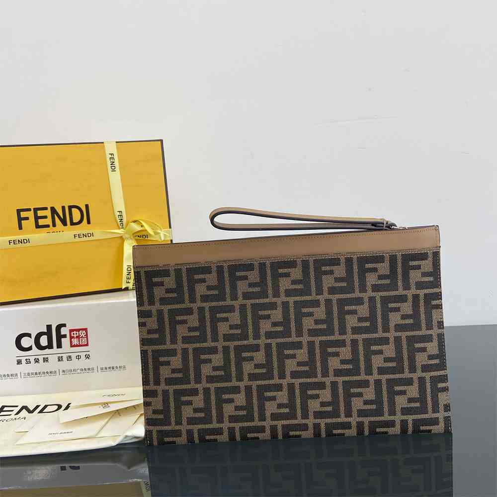 Medium-sized flat pouch with zipper. Made of brown and tobacco jacquard FF motif fabric. Silver-colored Fendi Roma lettering on beige leather and embellished with bracelet handle. Palladium-finish metalware.