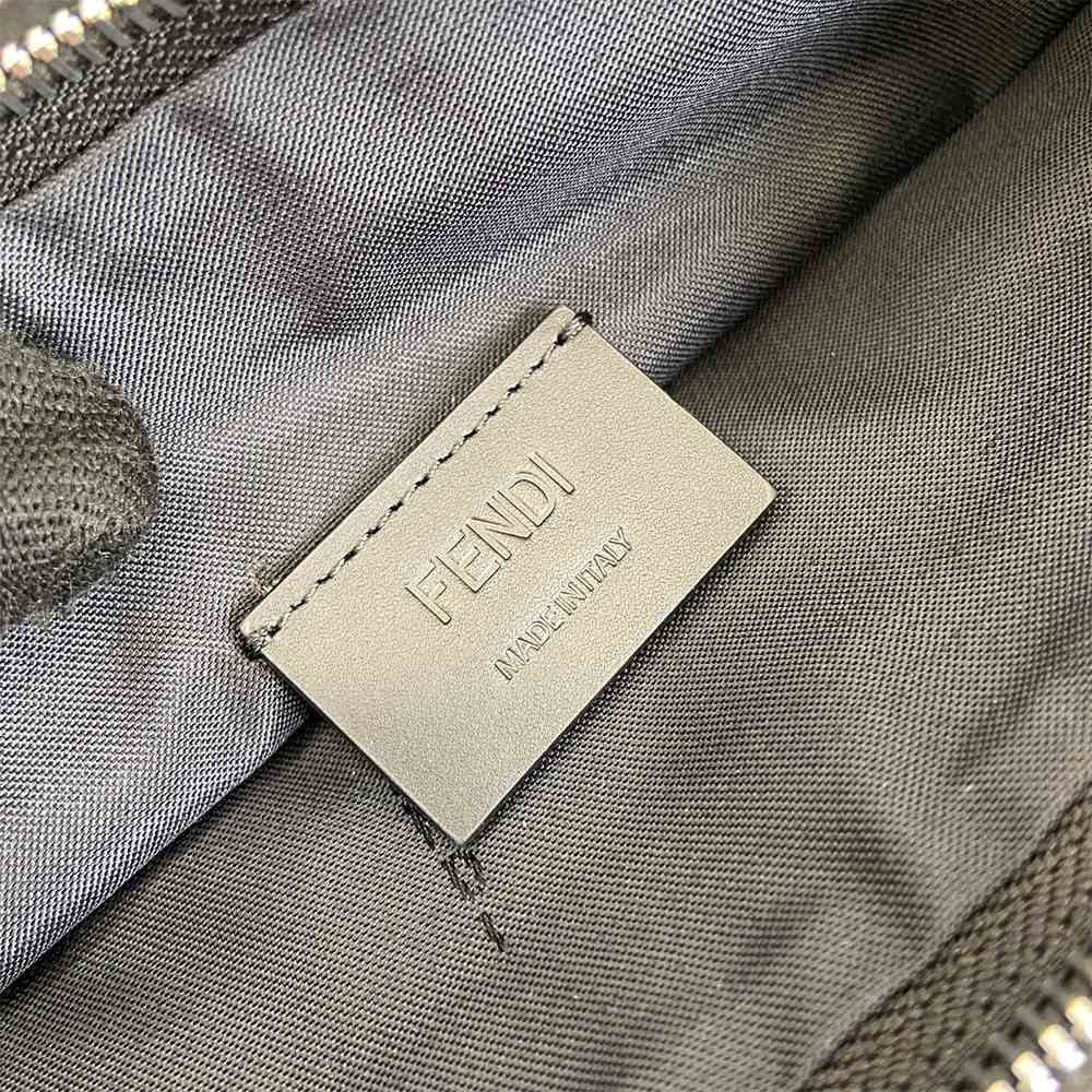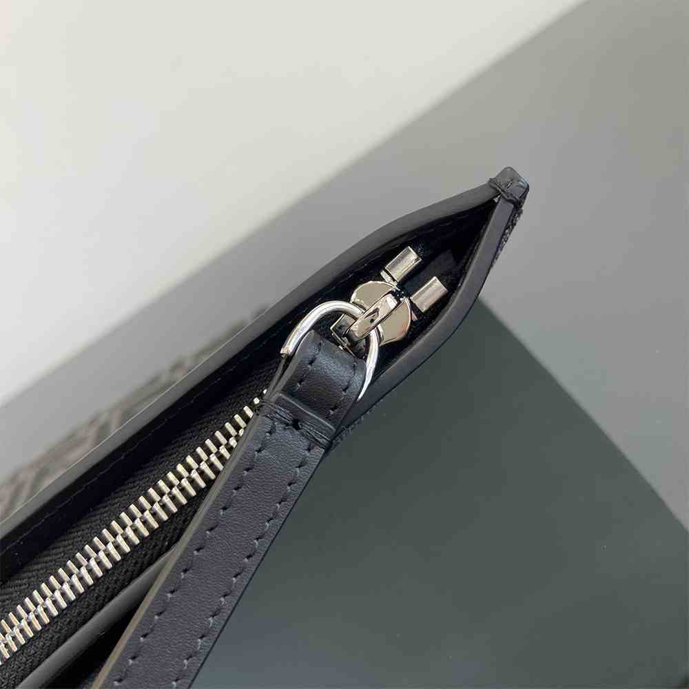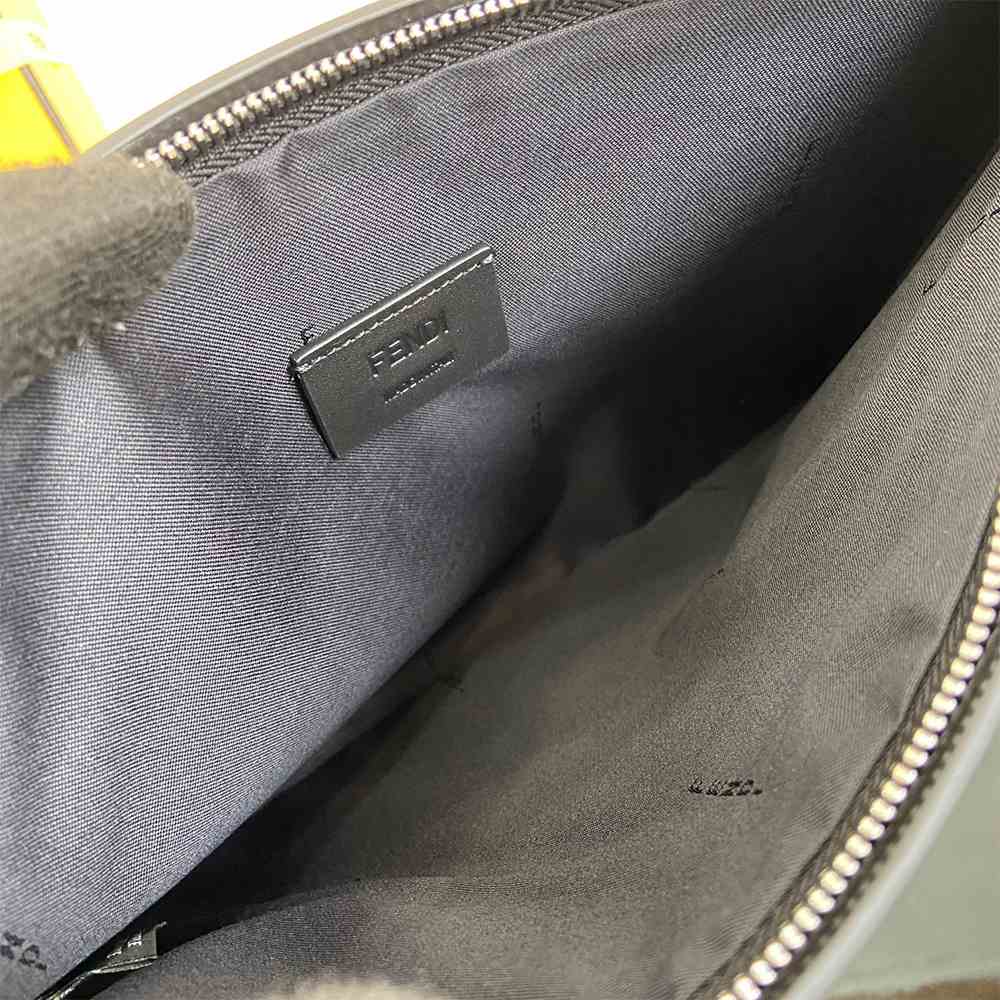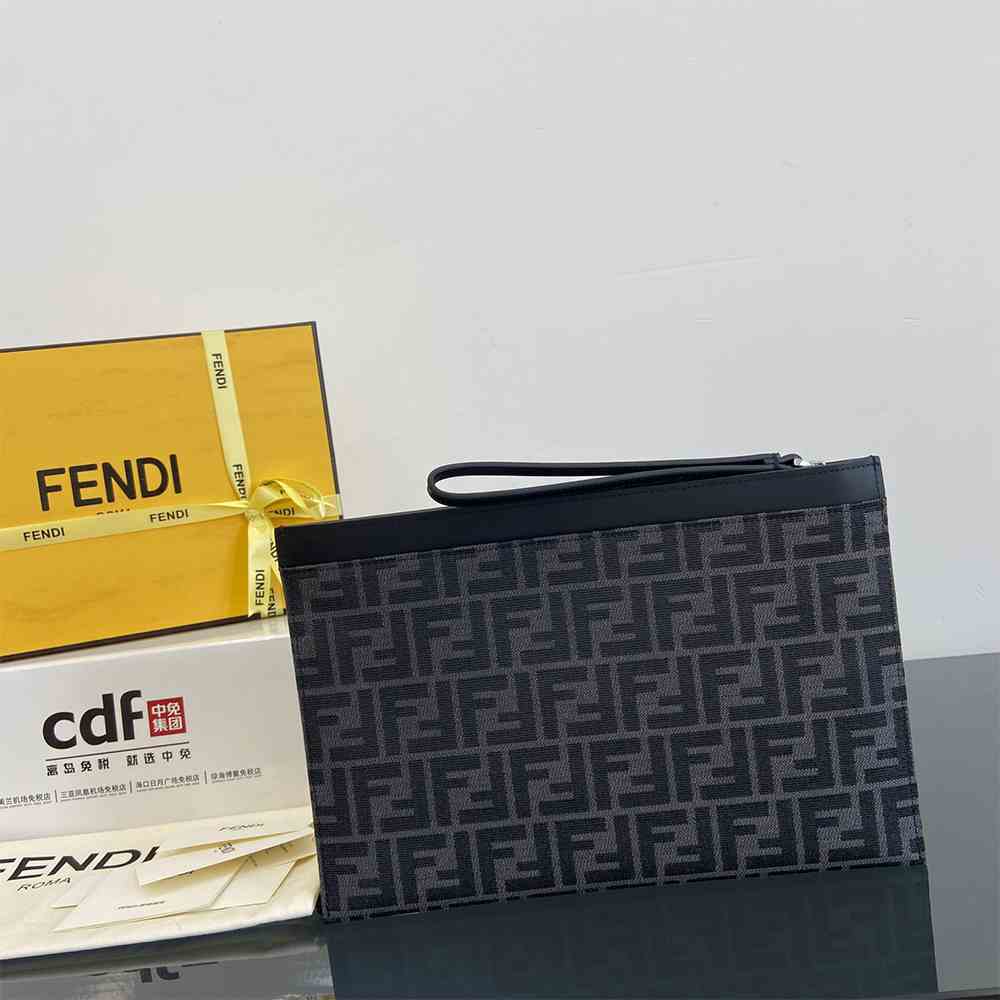 Medium-sized flat pouch with zipper. The item, made of black and gray FF jacquard fabric, is part of the collection curated with designer Stefano Pilati. Trim and bracelet zip pull in black leather. Palladium-finish metalware.