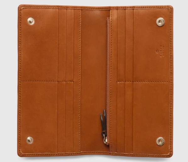 The GG Emblem collection reinterprets signature motifs through creativity and innovative functions , and is envisioned to be cherished for years to come. Introduced in the latest line of accessories, this beige and dark brown continental wallet is crafted from the new GG Monogram fabric. The design features an embossed Gucci on the front and a D-ring for attachments.