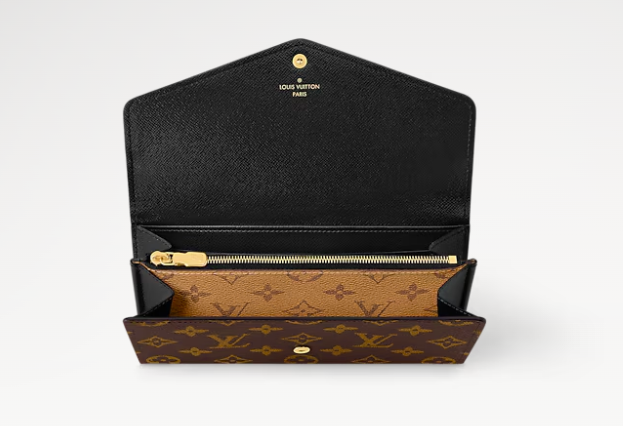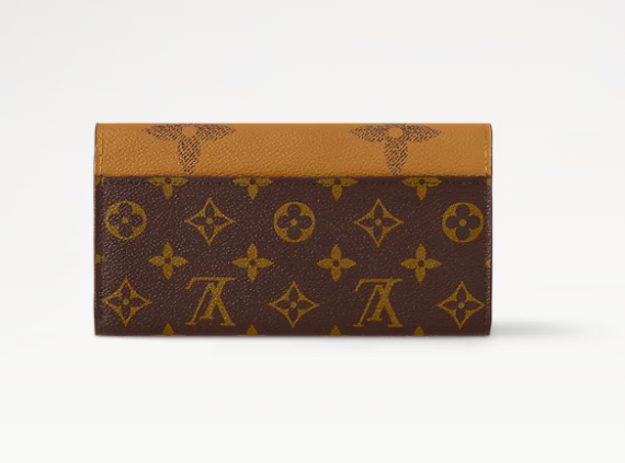 The Sarah wallet is revisited in an elegant combination of Monogram and Monogram Reverse Giant canvas. This classic, rectangular wallet is notable for its well-organized interior featuring an array of pockets and card slots. Its envelope-style flap is secured with an engraved, gold-tone press-stud.