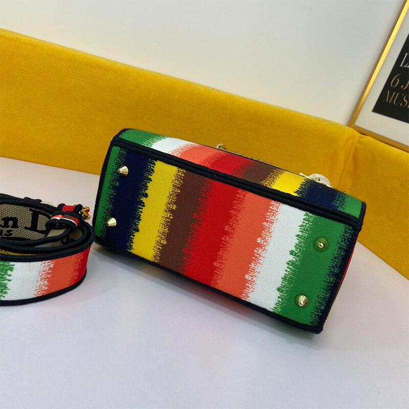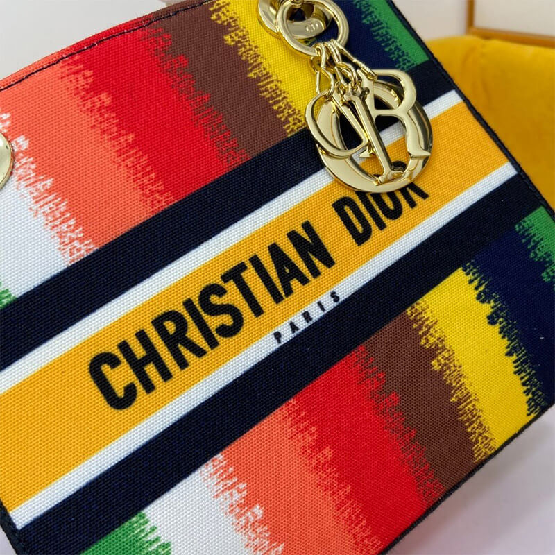 The Lady D-Lite handbag combines classic elegance with the modern feel of the brand. This style brings a new interpretation of the bayadere theme pattern this season. It is decorated with a full-scale multi-color mixed-color effect D-Stripes pattern embroidery, revealing a contemporary atmosphere, and the front is decorated with the “Christian Dior” logo. The thick gold-tone metal “D.I.O.R.” pendant is infused with pattern style. The medium-sized Lady D-Lite handbag has a wide, detachable double-sided embroidered shoulder strap, which can be carried, shouldered or slanted.