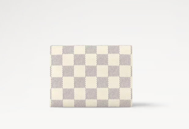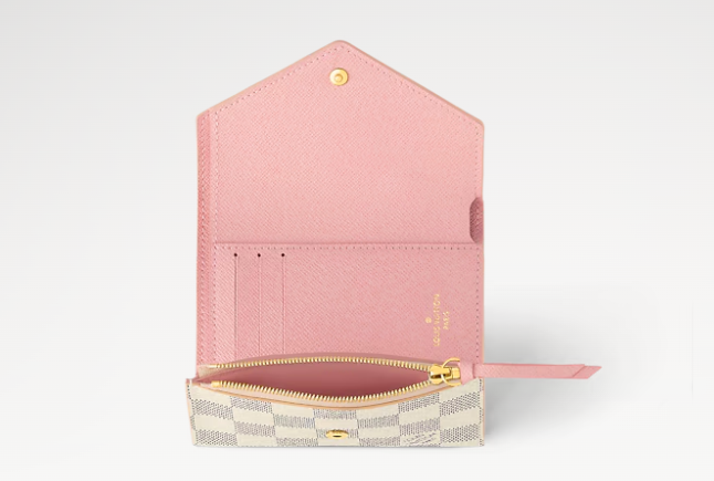 The compact Victorine wallet in Damier Azur canvas combines femininity and functionality. It opens out to reveal many practical features, including card slots and pockets for bills and coins. Its envelope-style flap is sealed with a press-stud.