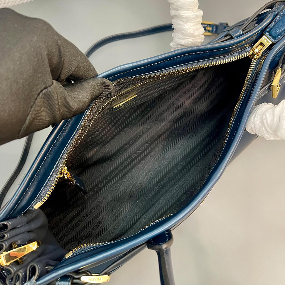 Nappa and nylon interior with center zipper compartment and zipper patch pocket