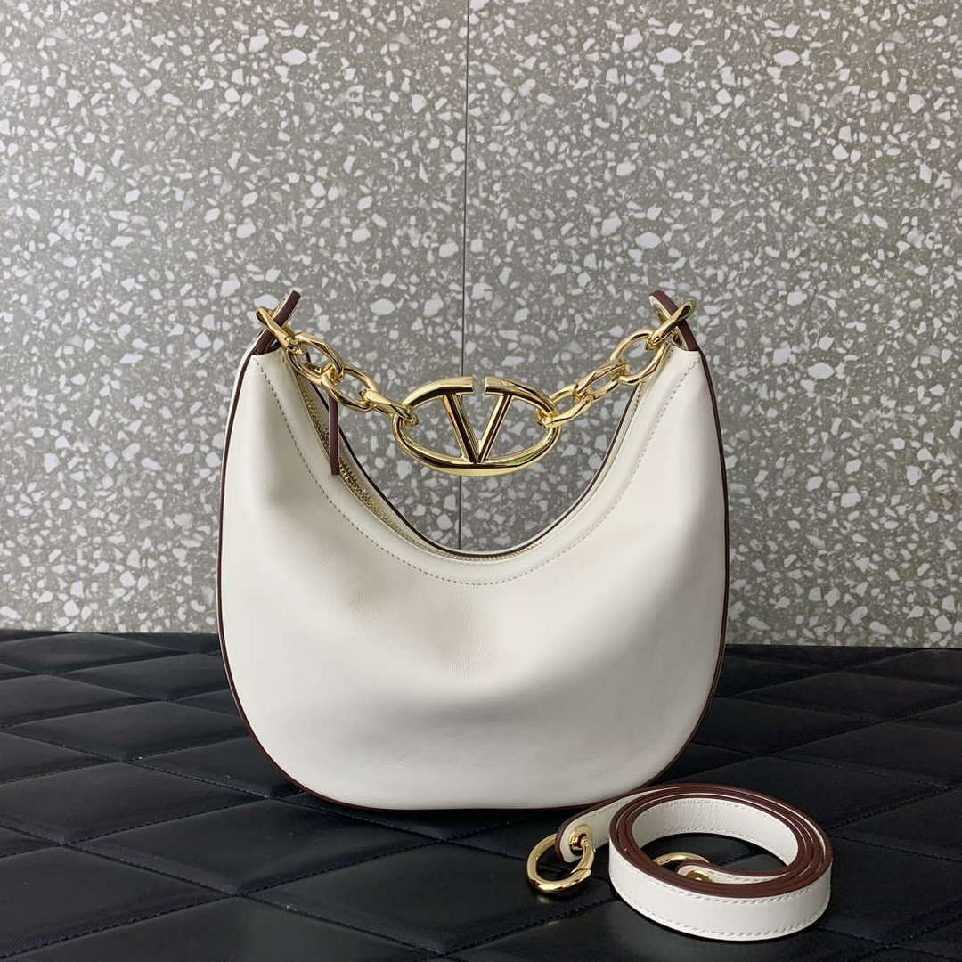 Valentino Garavani VLogo Signature mini hobo bag in grainy calfskin. Can be carried by hand or on the shoulder thanks to the adjustable handle.