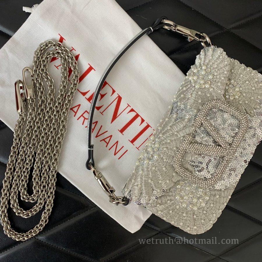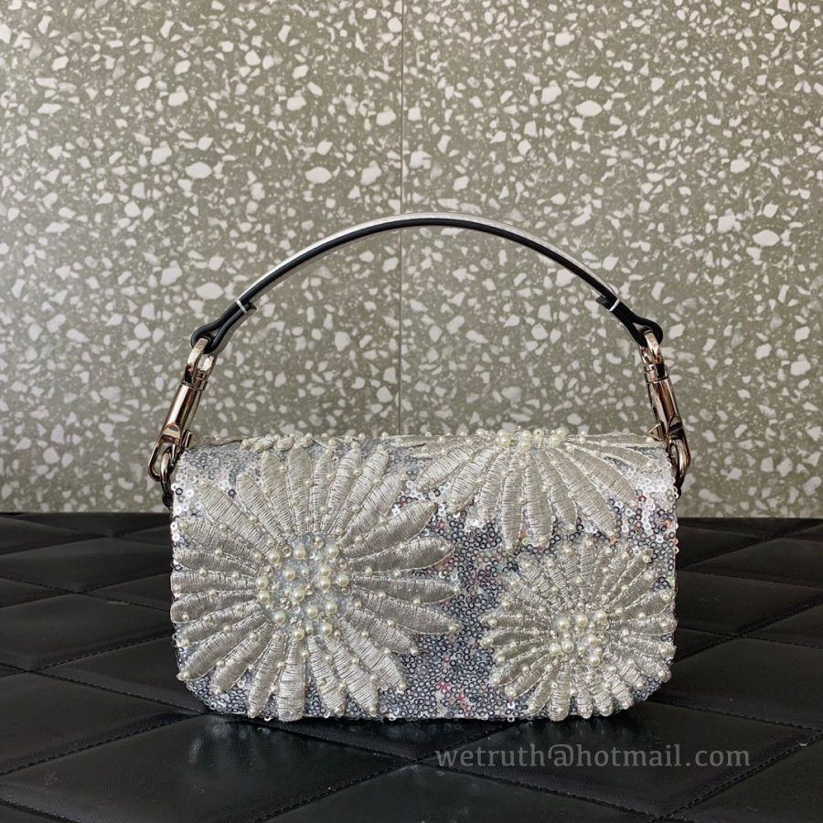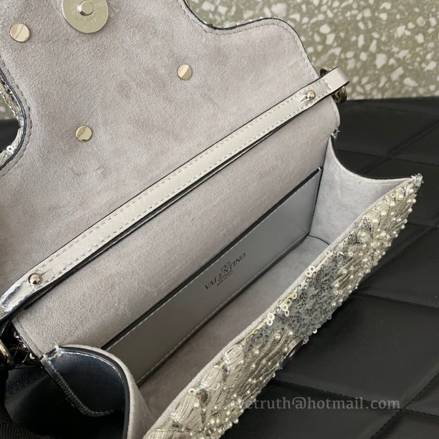 Valentino Garavani Mini Loco Embroidered Handbag, featuring metallic textured leather trim and VLogo Signature Swarovski crystal embellishment