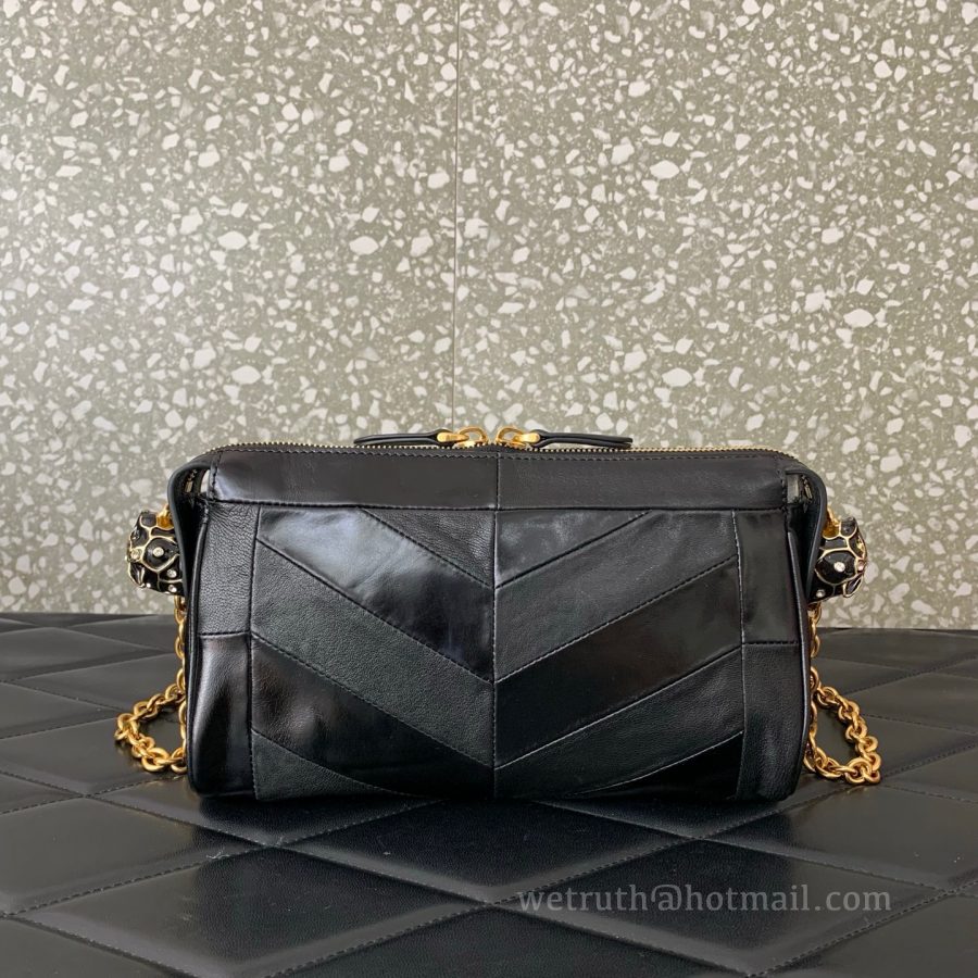 crafted from a combination of shiny and matte lambskin leather forming a V-shaped pattern. Adjustable shoulder strap design for both shoulder and crossbody wear.